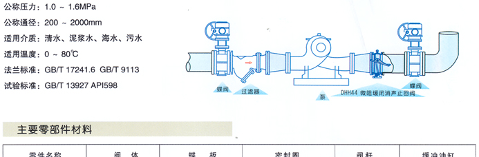 本厂生产的DHH44型微阻缓闭止回阀主要用于工业、城市给排水管道和高层住宅、高级宾馆、加压输水泵的出口处。在设计上充分考虑了使用环境的要求,采用斜板式结构,达到无震动、无噪音、运行平稳,确保宾馆、住宅环境安静。并具有节能的效果。用延缓关闭的方式使局部倒流水向系统内泄流。从而大大降低了停泵倒流的水压冲力,消除了破坏性水锤峰值的产生,截流密封采用丁腈橡胶,密封性能好、减震耐磨、使用寿命长、维修方便等特点。
