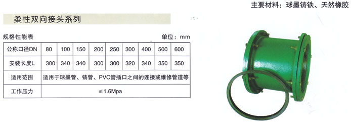 柔性双向接头适用于球墨管、铸管、PVC管插口之间的连接或维修管道等。柔性双向接头采用球墨铸铁、天然橡胶为主要材料。柔性双向接头密封性好,承受压力大、安装操作方便等特点是理想的快速连接管道产品。