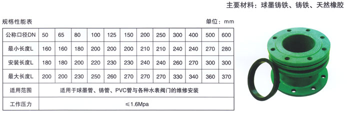 柔性伸缩器可为城镇自来水塔、泵房、水表及阀门安装拆换提供极大的方便,以及对长距离管道因温差引起的伸缩问题,起到了良好的填补作用,代替了U型管。套管式伸缩器产品可用于给排水工程方面,用于热力工程方面的,一般温度按250℃,压力按1.6MPa出厂。同时也可根据用户的需求而生产特殊参数系列的产品,以满足于煤气、石油、化工、水电等领域,其连接形式有:双盘式、插盘式、承盘式;法兰连接尺寸按现行国家标准,可按用户要求加防拉脱限位螺栓。